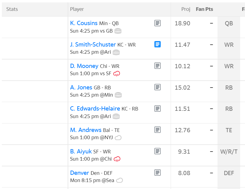I was set to rank this roster much higher until I got to the flex spot. DJ Chark? Is he serious? There’s like 10 different options that are better sitting on the waiver wire. Aside from that his roster is easy to hate on with a large contingent of Steelers and Ratbirds, but is made up for by the blessed presence of Nicholas Chubb. Cole Kmet is basically the only option for Justin Fields, so I expect him to finish as a top 5 TE. Please do something about that flex spot Bob.